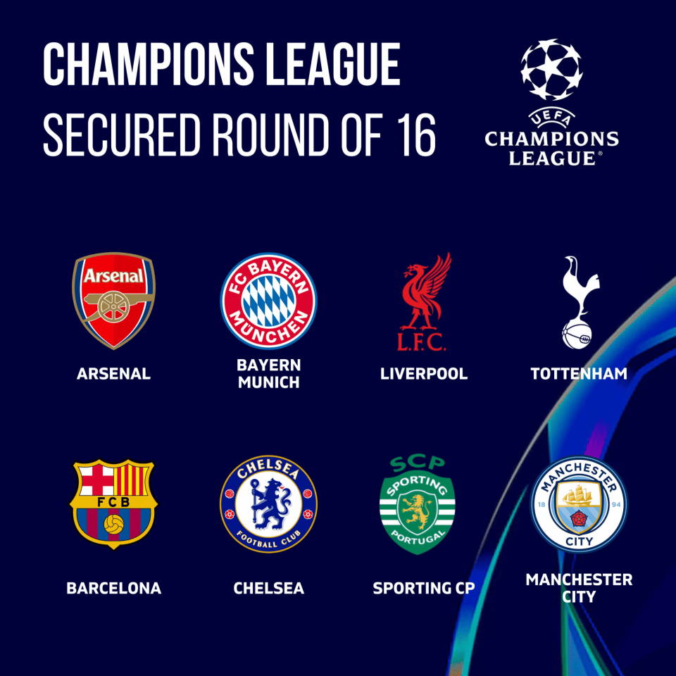 在附加赛中获胜的8支俱乐部将晋级16强,与直通的8支队(阿森纳、拜仁、利物浦、热刺、巴萨、切尔西、葡萄牙体育、曼城)一起,组成本赛季欧冠16强的最终阵容。